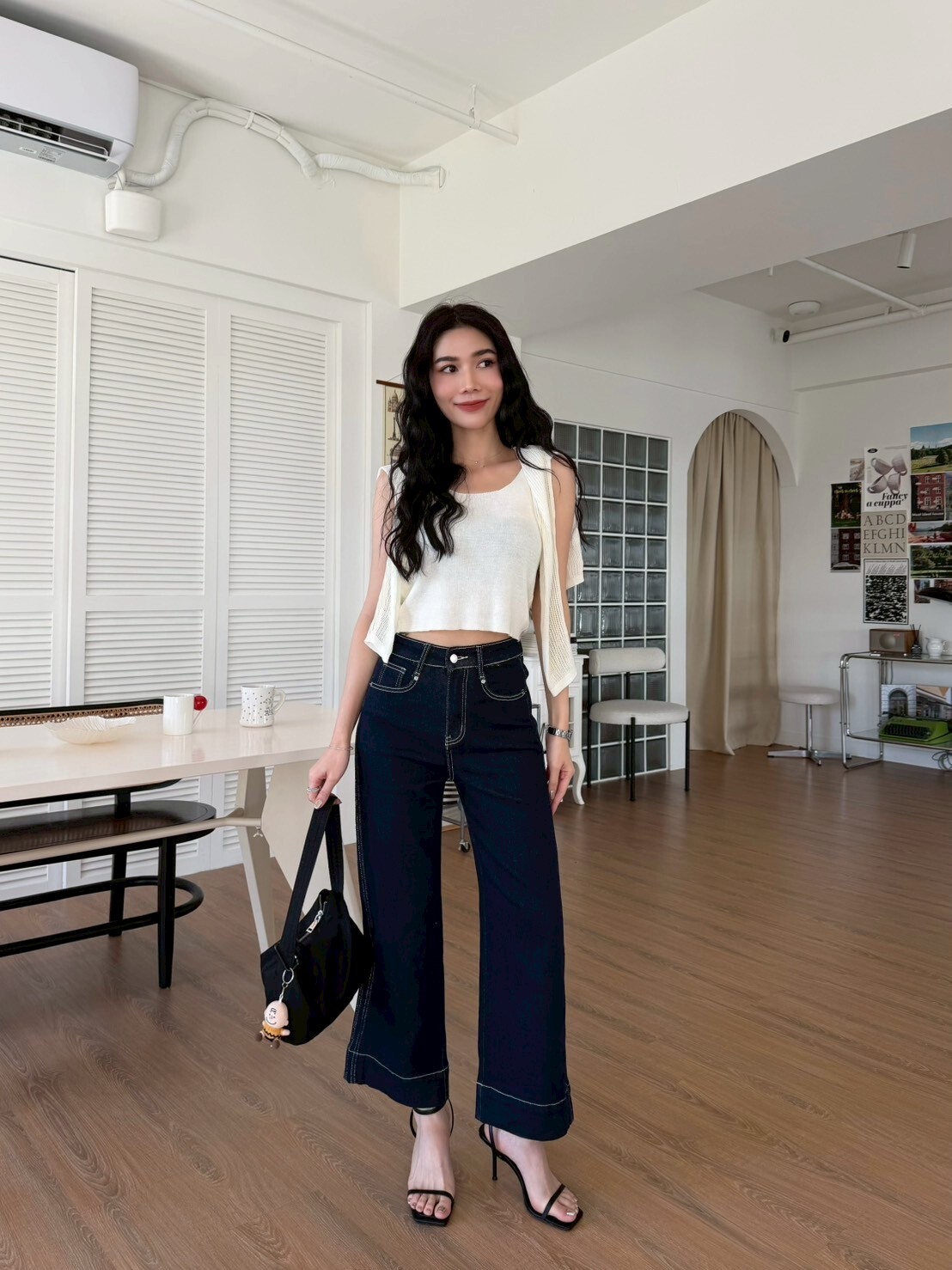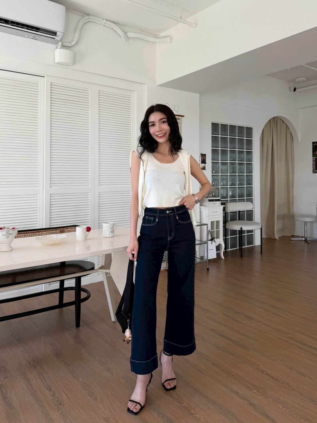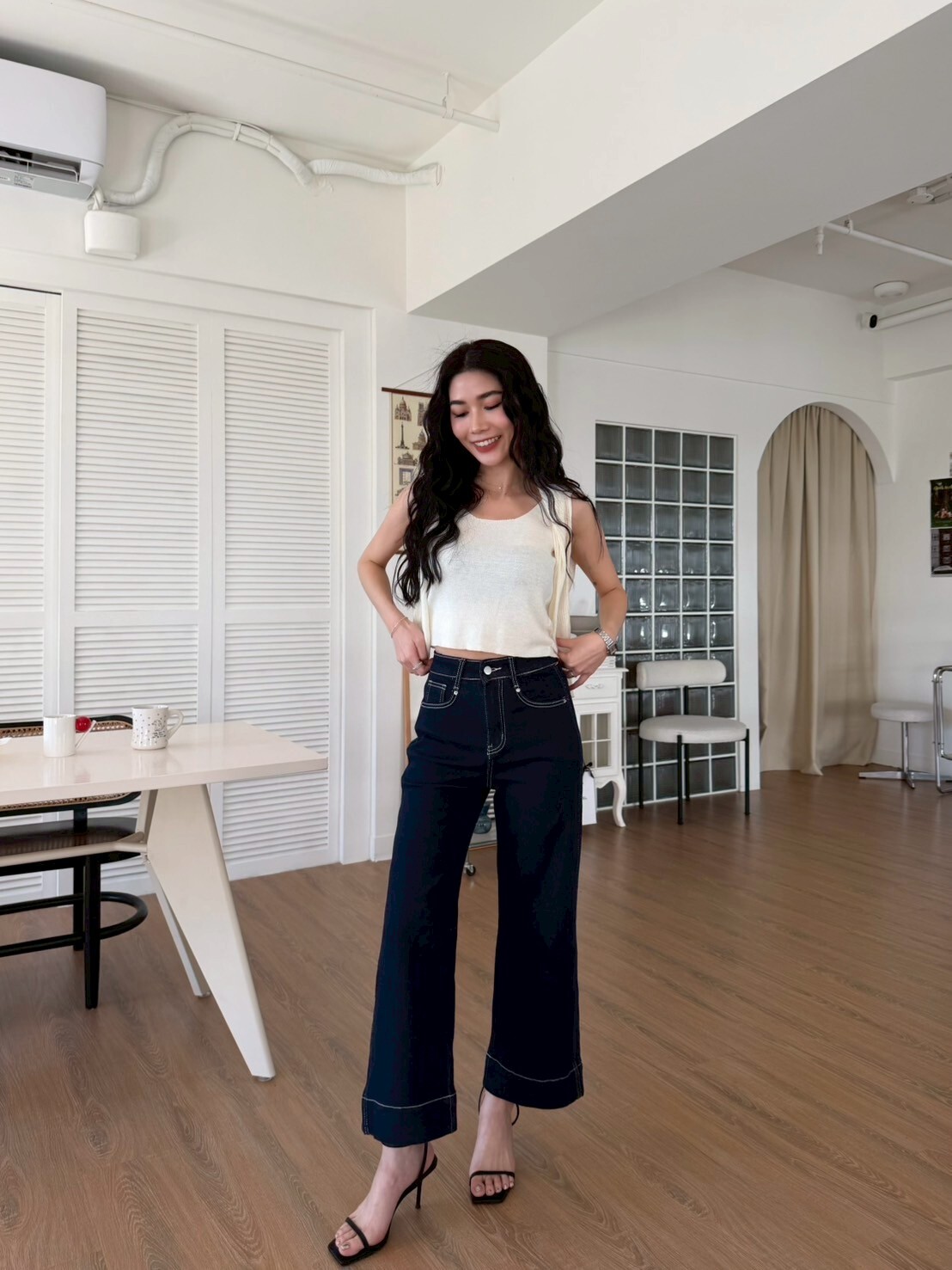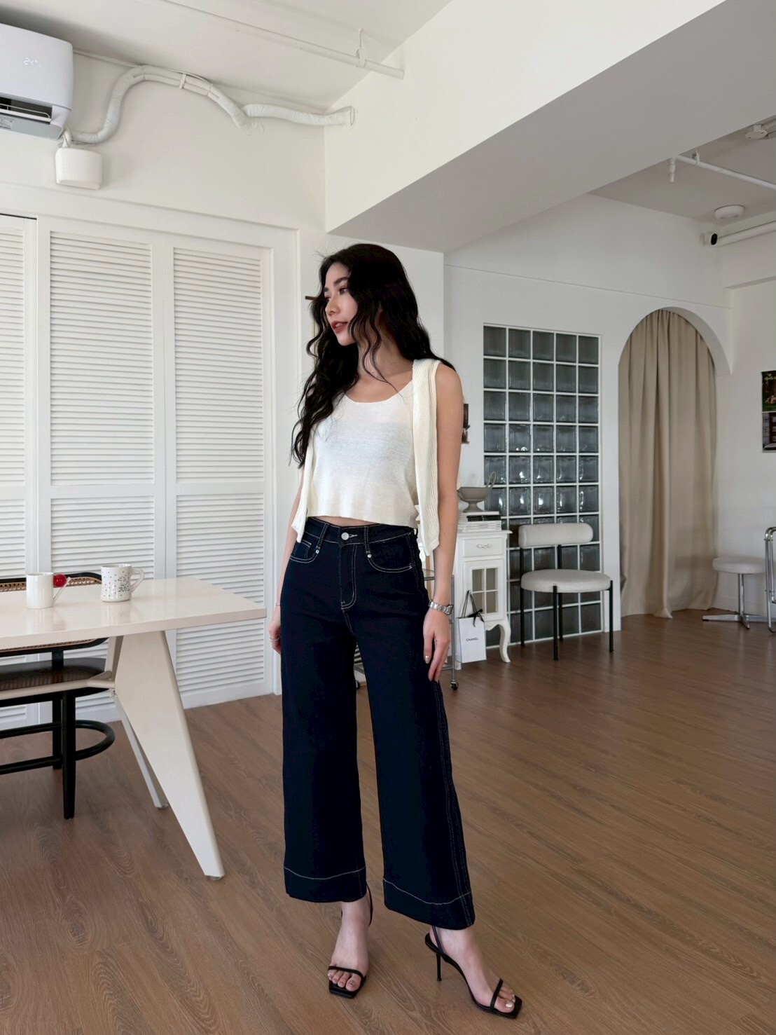 車縫線八分牛仔寬褲