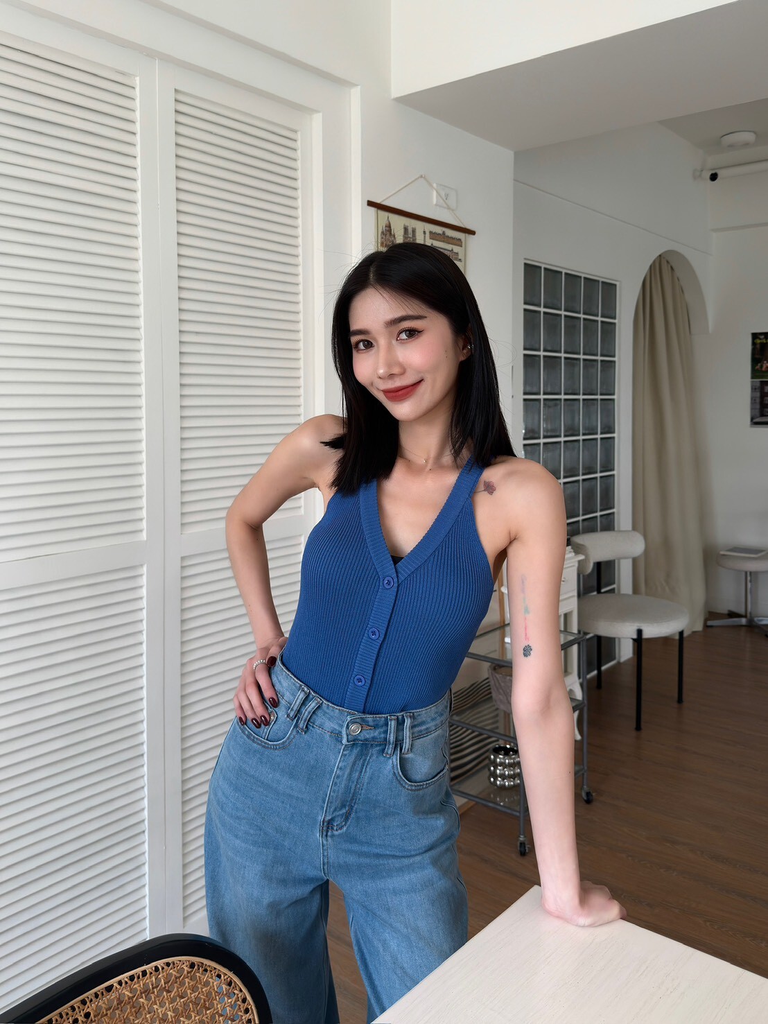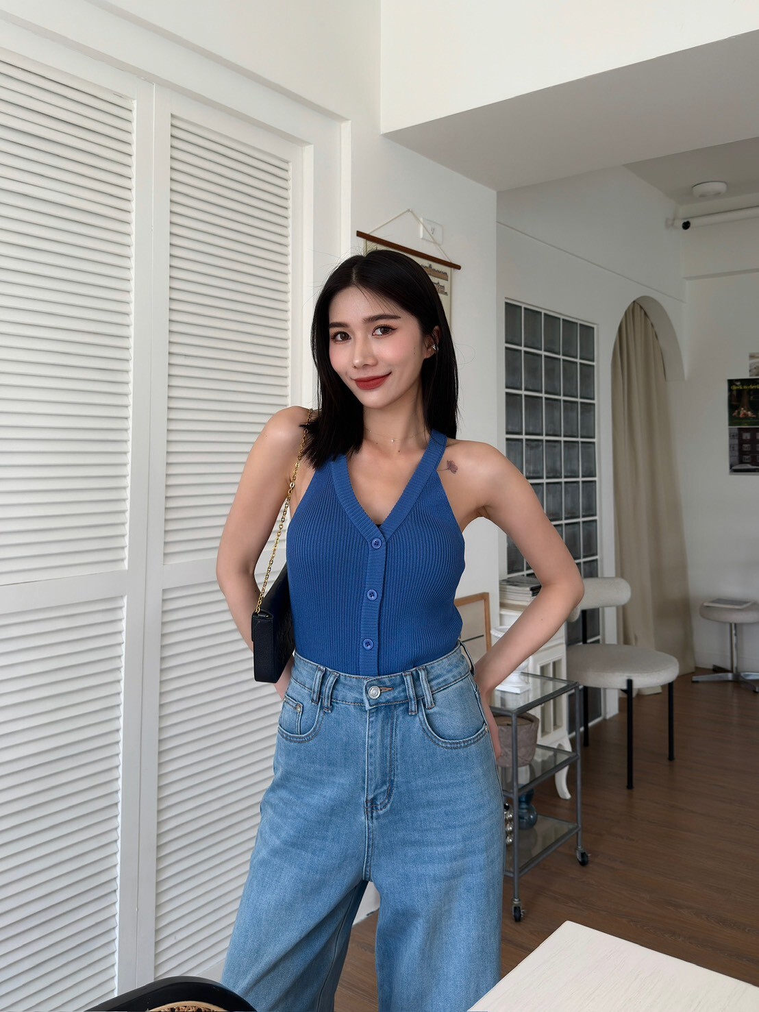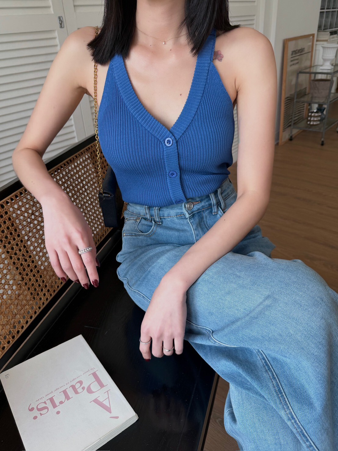 削肩坑條排釦針織背心