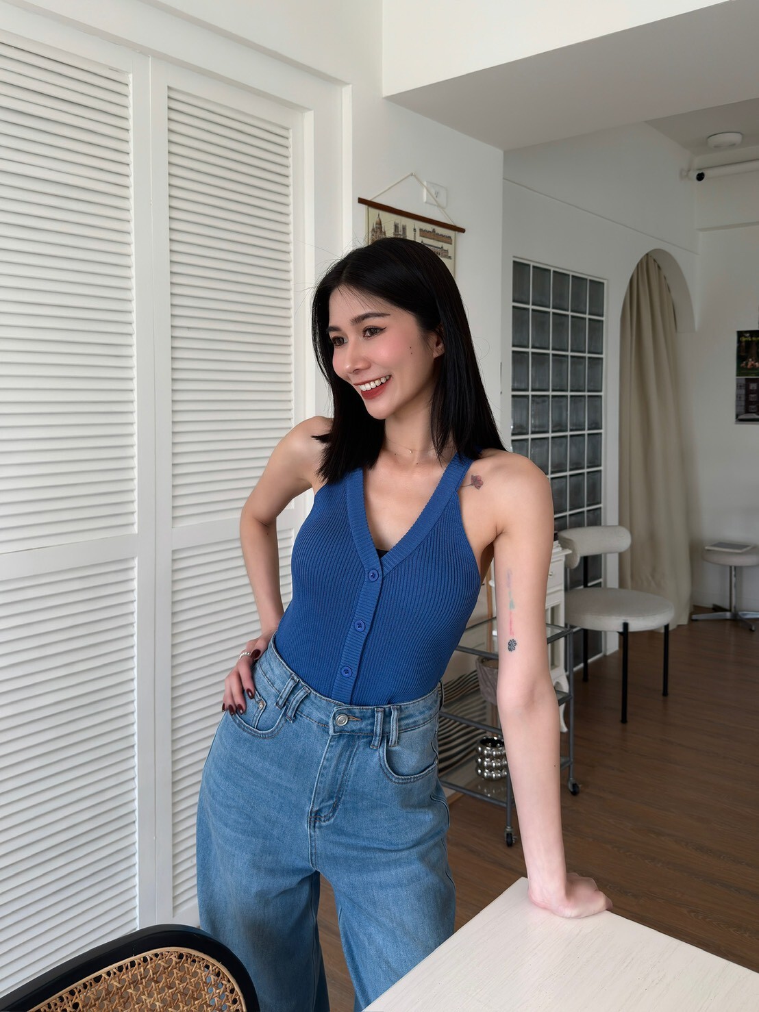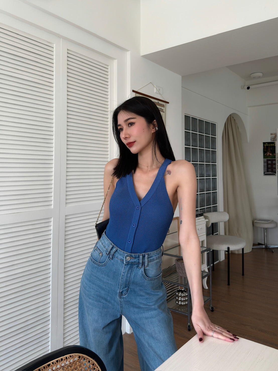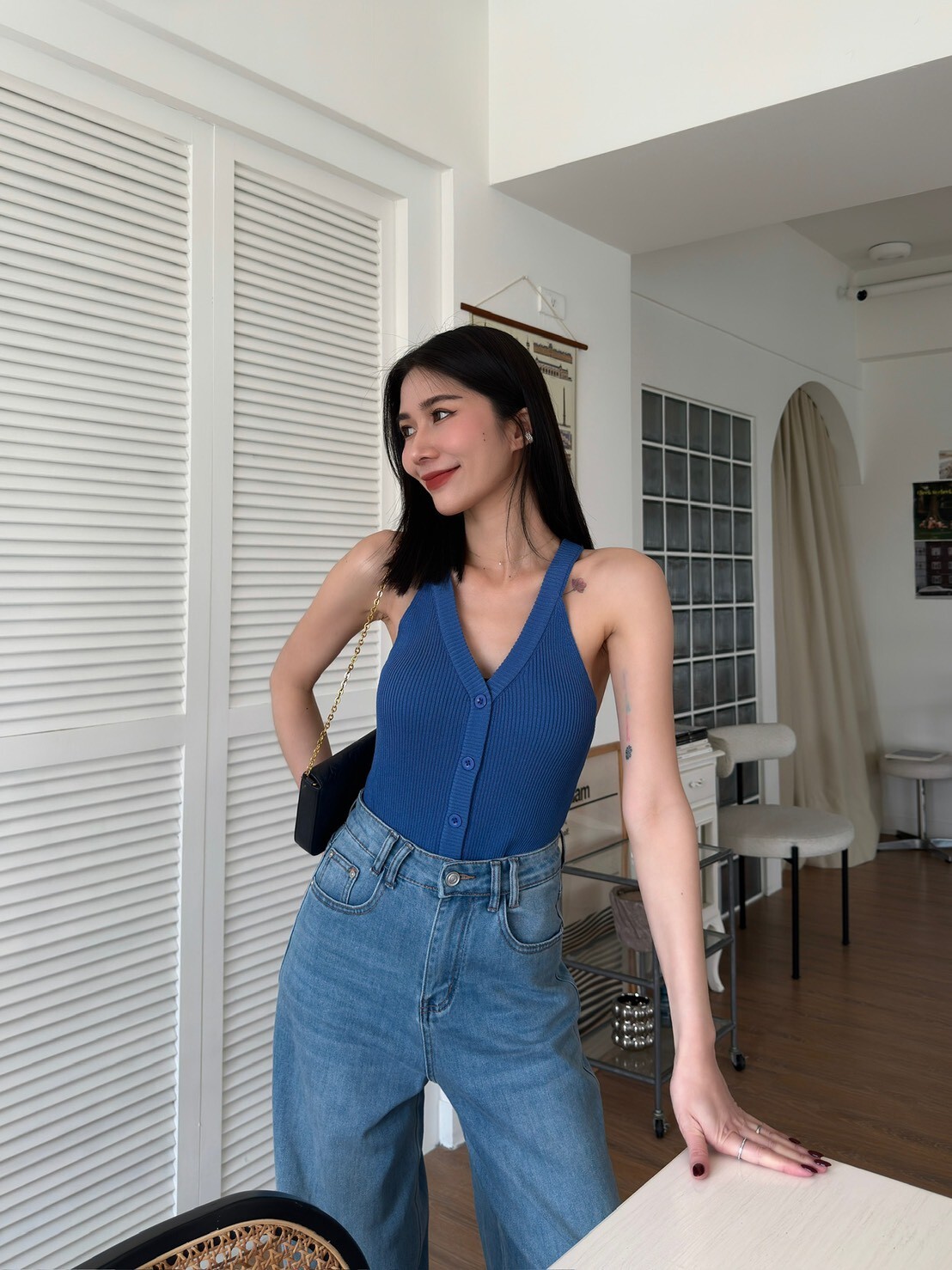 削肩坑條排釦針織背心